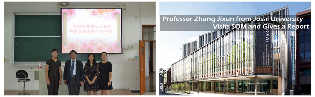 Professor Zhang Jixun from Josai University visits SOM and gave an academic report to teachers and students of international business major in the afternoon of September 15, 2015. The title of the report is “Trends of Japanese economy and changes of Sino-Japanese economic and trade relations”. Professor Zhang Jixun was hired as a lecturer at the Ibaraki University, Japan, in 1990 and transferred to the Josai University and served as associate professor and professor. The main research fields of professor Zhang are international economy, Asian economy, China's labor economy and social security. He is also the initiator and leader of various Chinese communities in Japan.